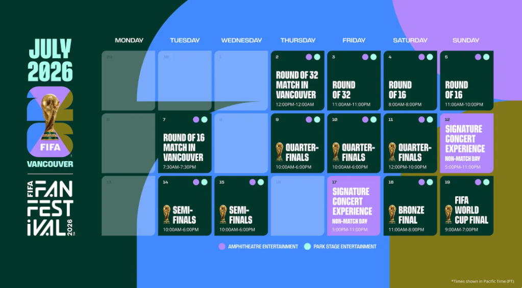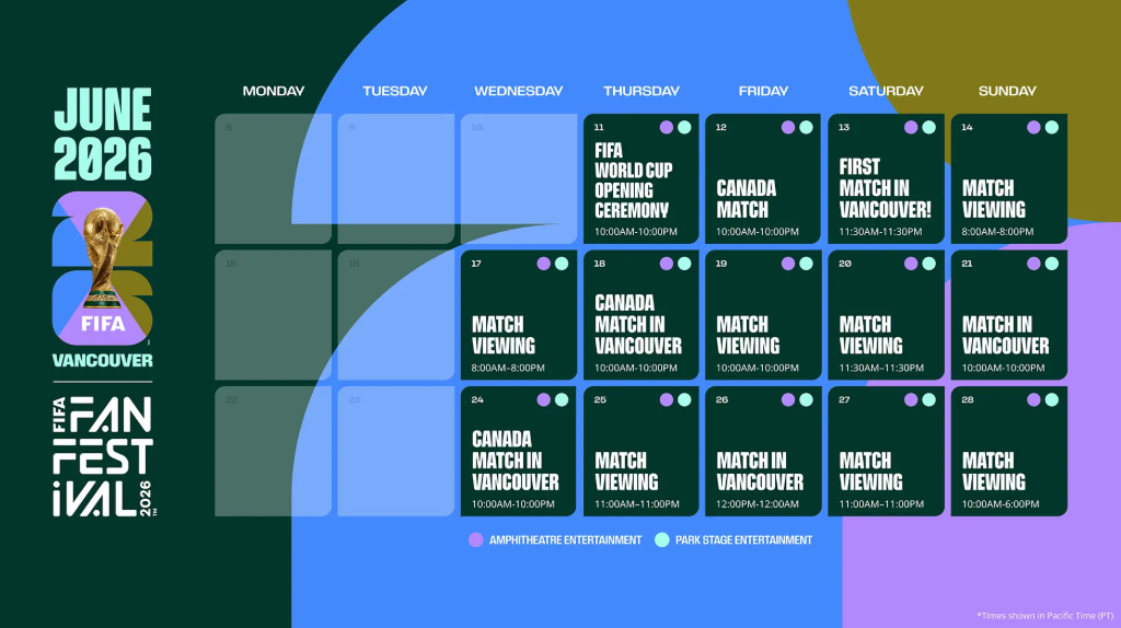 FIFA Fan Festival™ Vancouver is the city’s official destination to watch the FIFA World Cup 2026™ live. Across 28 days, more than 70 matches will be broadcast live on screens throughout the Festival grounds creating a high-energy, stadium-style atmosphere for fans who want to experience every goal, every chant, and every moment together.