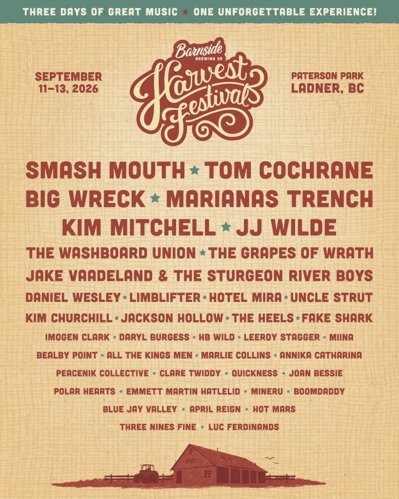 The festival runs across three stages — the Barnside Brewing Main Stage, Dueck Cadillac Stage, and City of Delta Stage — featuring a multi-generational lineup spanning rock, country, alternative, roots, and beyond.